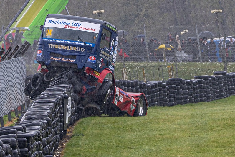 The photographer caught this at the optimum moment of impact. Although the shutter speed is high there is a sense of movement here. The crowd in the background show how wet it was on this occsion but I think I might have cropped this down to a square format concentrating on the truck. Nicely captured. |