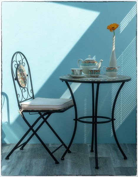 The still life effect of the table and chairs is good on its own but what makes this is the light and shadows. It is clever how the areas that could burn out are in the shadows. The pattern on the chair is nicely in the lit area. |