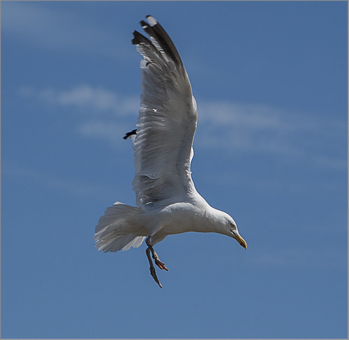 This is a well taken and well timed image. The bird fills the frame nicely although I may have placed it slightly more to the left to give more space for it to move into and therefore a greater sense of movement. The lighting and exposure are good especially on the bright areas and the blue sky background was a real bonus on the day. |
