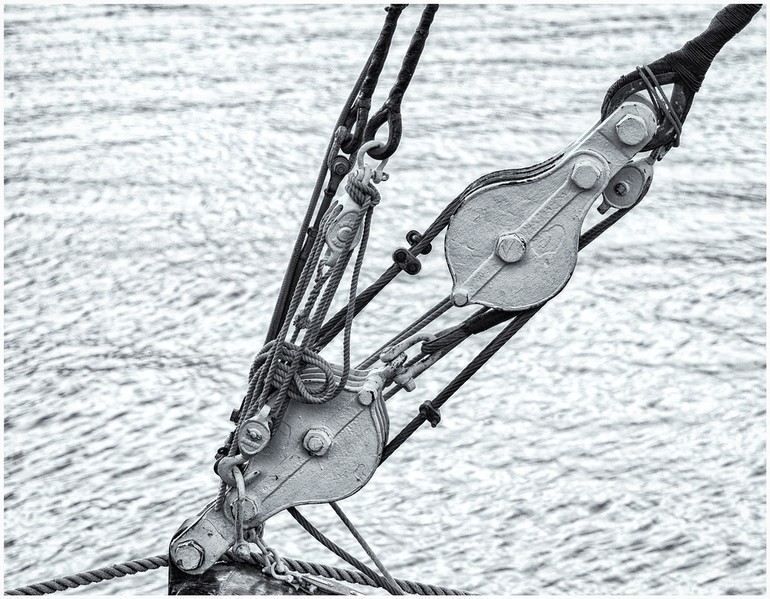 This is a very nice detail image showing a surprisingly complicated looking piece of kit. The use of monochrome has emphased the metalwork nice and there is a nice arrangement of shapes in the image. The background water is a little bright but this is a good image. |
