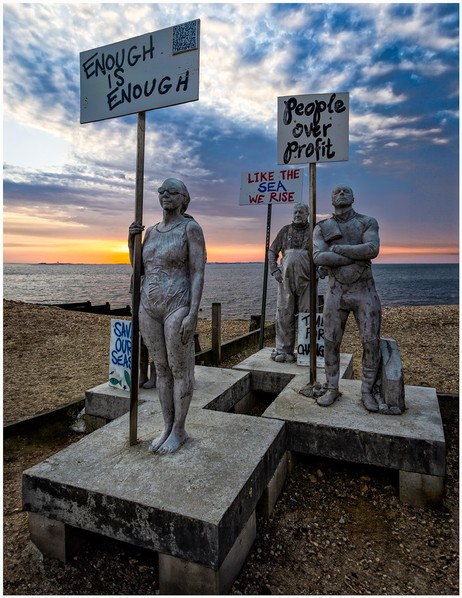 This is an image with a story and a message. Obviously the sculptures cannot be changed so the photographer has to add their own input which has been nicely applied here. The arrangement of the lines and pkacement of the placards is very good and the colourful lighting contrasts with the dark message. Thought provoking. |