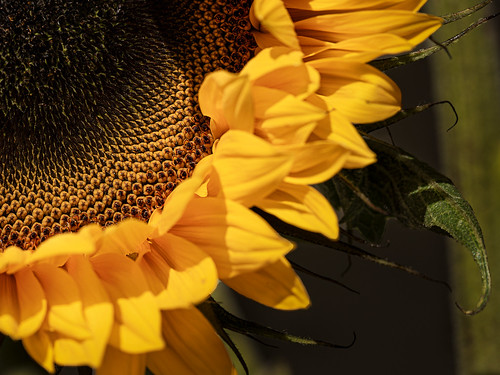It is refreshing to see a different approach to a sunflower image. I like the idea but may have cropped the right hand side to make a square format. Using a wide aperture has nicely concetrated our gaze on the sharp areas where there is some great detail. cropped off the right hand side to make a square composition. |