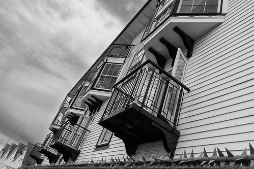 This is a clever approach to perspective. If the uprights were exactly that the line at the bottom with the scary looking metal plates could look awkward but making this feature level has creaed this interesting effect. The monochrome treatment is nicely done although I might worked a bit more on the sky, there does appear to be some detail there to extract. I applaud the different approach to architecture here. |
