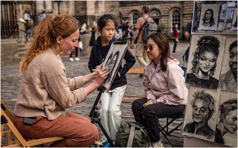 This is another image that tells a story. The focussing is vitally important here and it has been nicely applied to ensure the artist stands out from the background which is soft but sharp enough to set the scene. I like the faces of the previous artworks looking out at the viewer. |