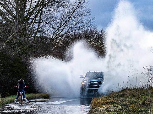 Timing here is everything and this is spot on. The plume of water and the well placed cyclist work well. Exposure is good and a great deal of tones have been retained in the highlights. In particular the rim lighting on the cyclist is very good. I would have cropped the sky to concentrate our attention on the action. As an example of always carrying a camera with you this is top class. |