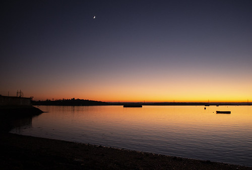 The tones in a sunset are constantly changing and quite often the best to appear are after the sun has dipped below the horizon. For me this image proves that. The deep hues are very good. The solid black silhouettes may have worked better if their shapes were more distinct and bold. The horizon is well placed and the Moon is a nice added touch. |