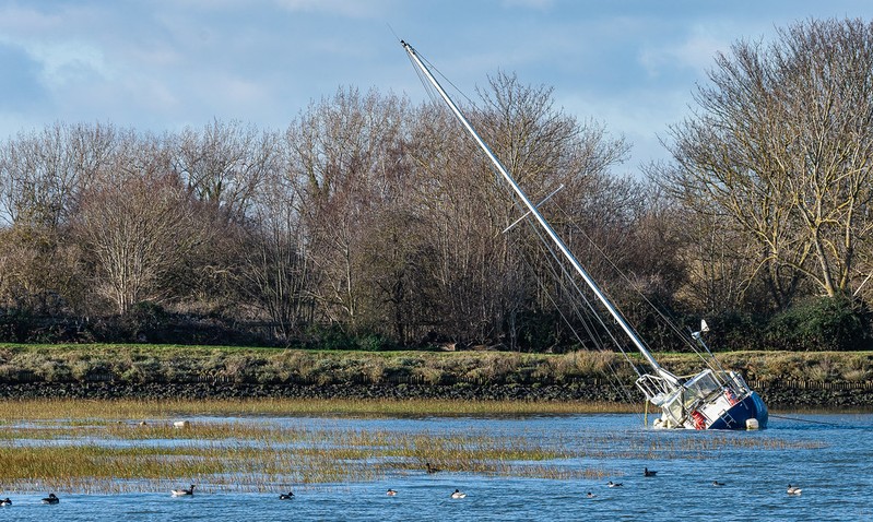 There is definitely a listing issue going on here! As a composition it is actually qute good. The vegetation and the ducks in the foreground water actually provide a nice lead in from the left up to the stricken vessel and the dynamic angle of the mast points us up into the sky area. A simple view but very well approached. |