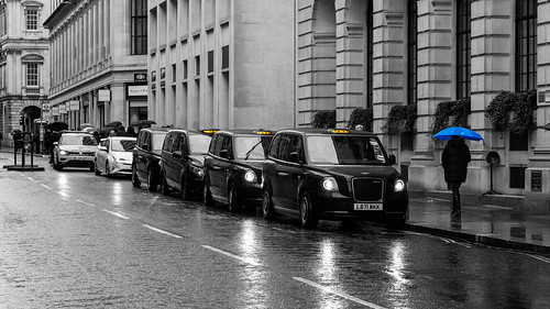 The use of monochrome works well here and it certainly accentuates the weather conditions. The contrast range is very good as well. The subtle colour popping is very effective on the taxi signs but I might hasve chosen a different shade of blue for the umbrella. Having saod that it would have been easy to chose a warm colour like red but the blue does add to the general atmosphere. |