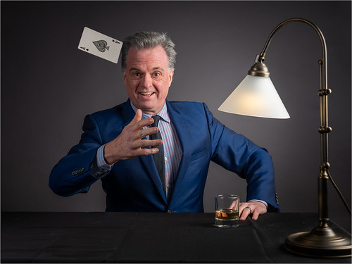 A clever image which certainly looks genuine. ( I did wonder if the card had been added later but I'm sure it was there at the taking stage). I imagine there were a few attempts before capturing that card in that position. Away from that the image is a very high quality portrait of this chap and the props including the lamp and glass are great additions. |