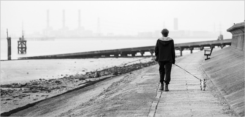 This is very well structured and shows great control of tones in a monochrome image. The structures in the water and the bench are great stops within the composition. The background is nicely muted but still recogniseable. The real masterstoke is having the figure vey strong in the space but still retaining detail in those very dark tones. It would have been very easy for the figure to merge into the background if the tones were not so well controlled. The angled lead to the dog is the icing on the cake. Very nice indeed. |