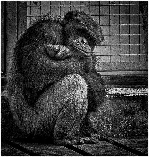 To me this picture tells a vivd and somewhat sad story. The chimpanzee which is exceptionally well presented in monochrome with superb sharpness, tones and detail has an air of melancholy about it with a bowed head with the bars behind it. The deep set eyes staring straight at us are the icing on the cake for me. Powerful stuff. |
