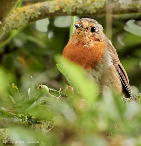 It is great to see a robin in an environment like this and not on the ubiquitous garden fork handle, good as those images often are. Here the foliage is a little bright and there is a tad yellow colour cast but the shallow depth of field and accurate focussing concentrates our gaze directly on the birds eye. Very good. |
