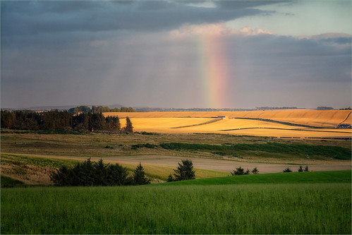 The rainbow is certainly a great addition to what would otherwise have been a failry mundane image. The colours work well together. The road is an unfortunate inclusion although some careful work in a photo software should reduce or even eliminate this. Well done on carrying a camera at the time and noticing the rainbow. |
