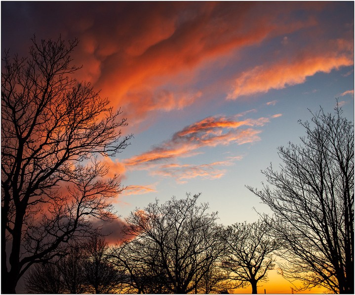 The skeletal tree silhouettes wuth their masses of detail contrast well with the excellent sunset tones. Even the shape of the clouds appears to mirror the tree shapes. Cropping the trees halfway down their trunks does unbalance the image a tad but otherwise this is a fine sunset with a difference. |