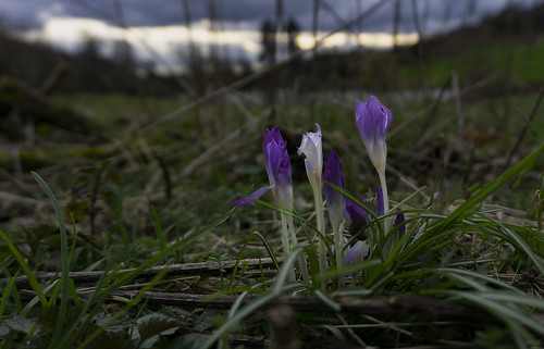 It is encouraging to see someone trying something different. The study of the crocus plants themselves is good with a spot on point of focus. The bright patch across the sky is a distraction that I would have removed but I do like the lower portion of the image. |