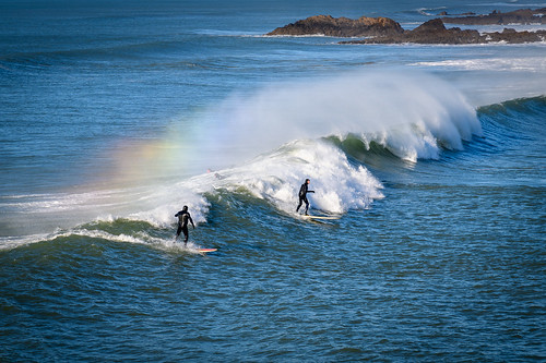 There is a great deal going for this image. The lighting and dynamic composition work well and the surfers themselves are nicely rendered. The wave spray with the rainbow is excellent too. The only recommendation I could give would be a tighter crop to exclude the rocks. For me this would tighten the composition even more and enhance the title more. Well seen and well captured. |