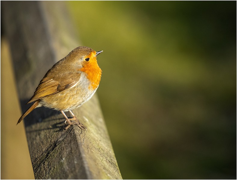 Extremely well placed in the picture space and the little chap seems to be basking in the light. Even the lighting in the background matches the situation of the bird. Nice to see it not on the ubiquitous garden tool handle. The angle of the fence also adds some dynamism as well to the composition. |