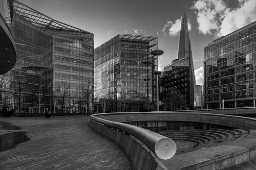 This is an interesting piece of modern street architecture. The curves contrast nicely with the angular buildings behind. The lighting is behind the buildings throwing the area in the composition into shadow. The monochrome treatment is a nice idea although a little more detail contrast could be worth trying. A crop on the left closer to the 'Scoop' really strengthens the image for me. An interesting subject. |