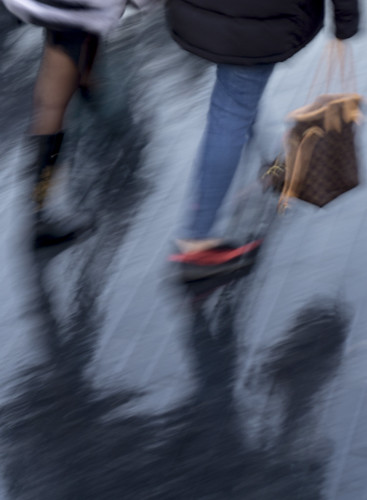 I was initially a little confused by the title but the image really conveys a wet day. I enjoy the movement giving the impression to get indoors quick. The diagonal lines and the legs moving out of the top really enforce this and the shadow shapes give a firm base. The object which I assume is a bag looks a little strange but overal I enjoy the atmosphere and feel of this. |