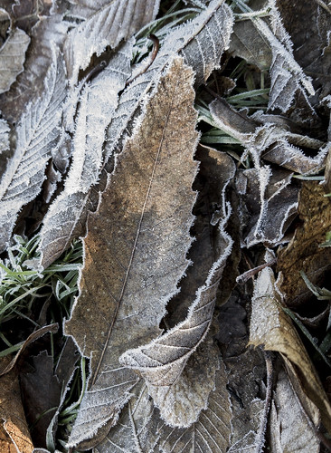 This is a well seen image and I like the composition. The frost has been well rendered. The top of the image does go out of focus indicating limited depth of field which is a slight shame. I don't know what control of aperture the photographer had but I would suggest stopping it down or holding the camera perfectly parallel to the subject. The colour combination with the warm browns against the ice works well. |