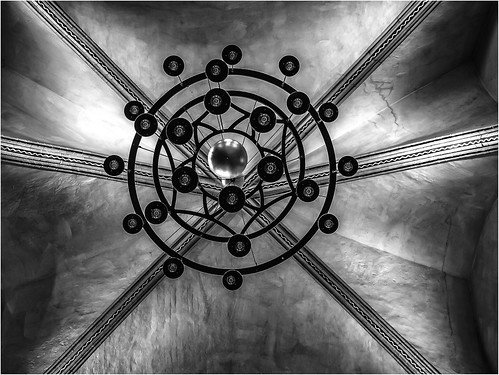 I had to look at this closely before I realised we were looking straight up at the base of this light fitting. The effect is very good and the dark black areas contrast nicely with the softer tones of the stonework. There are some mackie line effects around the chandalier which could indicate over sharpening but these do not appear elsewhere so it could be natural alighting effect but be aware of this if it an oversharpening result. Without doubt the globe is agood addition to the composition.. |
