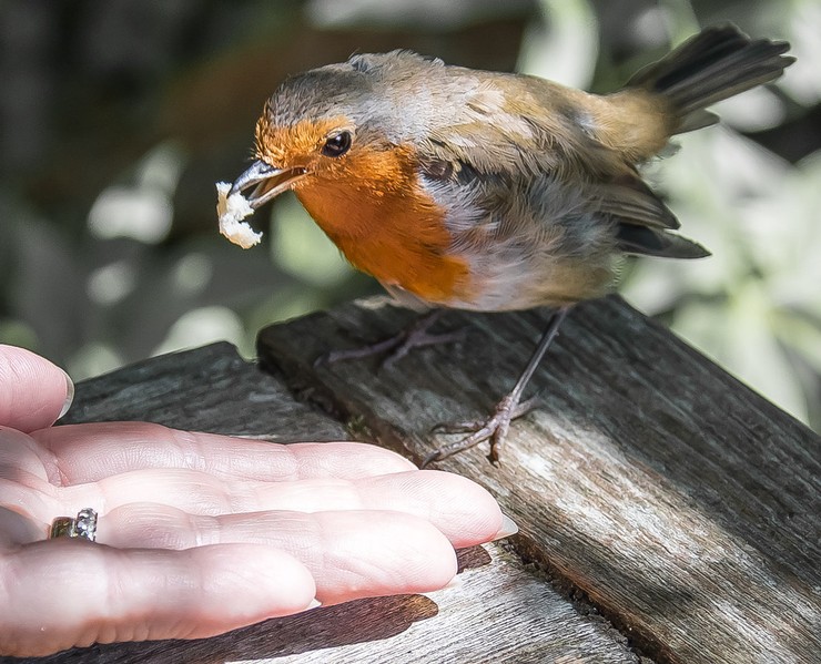 We often see robin images showing the birds perched on a spade handle etc so it is interesting to see one feeding from a hand. The robin itself is nicely rendered although depth of field does fall off a tad but the all important eye is nice and sharp. Bright areas in the background and the light skin tones are a little distracting but this is again a well captured and nicely timed image. |