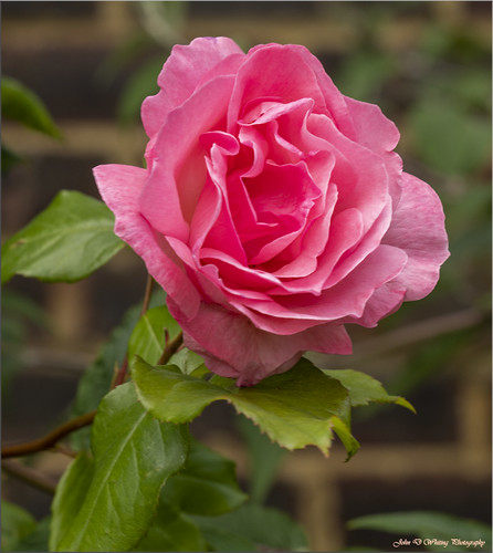 This is a competent image of this rose. A nice example in good condition has been selected which is important to me for an image like this. The soft lighting works well as does the colour palette with the warm rose against the cool greens. I think I would have moved the rose head to the left slightly but otherwise this is well done. |