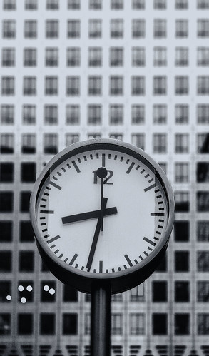 A simple but effective image. I like how the depth of field has isoloated the clock from the background. If the background was sharp the clock may well have clashed with it in this monochrome picture. The monochrome treatment incidentally has a nice bite of contrast to it. As this could be classed as a pattern picture it is not quite symmetrical, a small step to the left would have created an even image all round. The lights bottom left caught my eye at first but I think they are a good addition to the compositiion. |