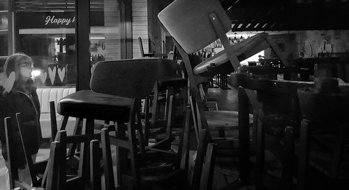 An image with a story that echoes 2020 all through it.The photographer has done well to extract the range of tones in the tables and chairs and to balance this against the lighted areas. It is a tad unfortunate about the only burnt out highlight in front of the figures mouth. Text in an image will always draw the eye so if it has to be present it helps to be relevant and the word 'happy' here is perhaps quite ironic. As this is a reportage style image the use of monochrome was a good move I feel. |