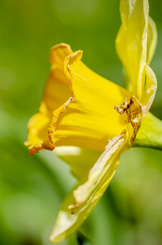 This is quite an abstract view of this daffodil. The depth of field is quite shallow and the angle of view has cropped the edges. It is interesting that the photographer has not chosen a pristine example. The colour pallette is simple but the colours are vivid and help to make this image something different. |