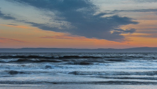 I like the movement of the waves here set against the static land and sky. The selected shutter speed has been well chosen. There is no 'zing' point to capture the eye but the diagonal cloud formation is well seen and are very important in this composition. I would have cropped off the bottom of the waves though as without this foreground there appears to be more movement in the water. The warm tones of the sunset colours contrast nicely with the cool blues elsewhere. |