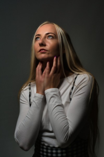 The lighting on this image of Connie is nicely controlled especially on the face. The image does appear to have a softness applied to it which works well with a female subject. Not sure about the fingers and the image does appear slightly underexposed but the gaze into the light is very good. |