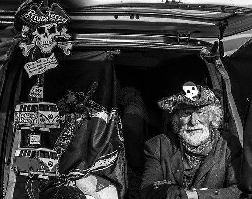 This is a real character study. I like the inclusion of his 'wares' as this sets the scene. The monochrome is contrasty but there is important detail in the face. I hope the photographer took more portraits of Pirate Terry as his face is full of character. |