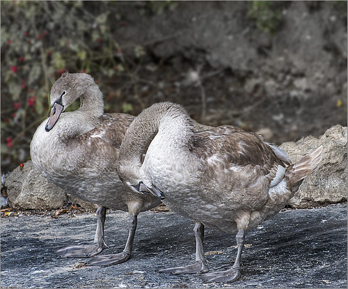 This is a nicely caught moment. I like the attitude of the two birds. The contrast does look a tad harsh on the soft bird feathers as if it is oversharpened or is a high ISO setting. If possible I would soften this down a little and crop the top slightly to lessen the soft background. Well seen and well taken. |