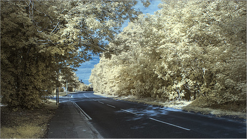 A great composition with lead in lines giving a nice 3D feel to it. The infra red treatment has given false colours but they are a nice combination. I feel the image needs something in the road to complete the story but as I said this is a well constructed image. |