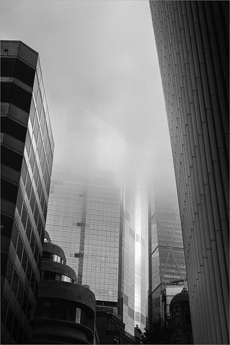 The use of monochrome is the perfect choice here to accentuate the fog. The convergence gives the buildings a feeling of height which indicates how low the fog is.Clever. The contrast has also been brilliantly handled as prologed viewing slowly reveals other buildings within the foggy areas. Very nice indeed. |