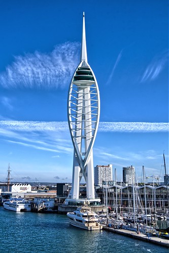 This is a fine view of the Spinnaker Tower captured on a very bright day but with the sun angled to give a raking light over the tower giving it form. Being a white subject there are burnt out areas but not enough to lessen the impact of the image. The wispy clouds and deep blue sky all add to a nice image. |