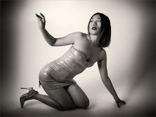 This is an interesting portrait. The pose fills the frame nicely and the shadows appear to be produced by the lighting so this looks like a well planned exercise. There is a bit of noise which indicates a higher ISO but the contrast is nicely controlled and there is a real sheen to the dress surface. Very good. |