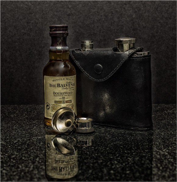 This still life/record image is very high quality and again shows the attention to detail given to it by the photographer. The shadowless lighting and background have been well chosen and having a reflective surface as a base works very well indeed. The monochrome looking tones nicely contrast against the brown tones of the whisky. Very good. |