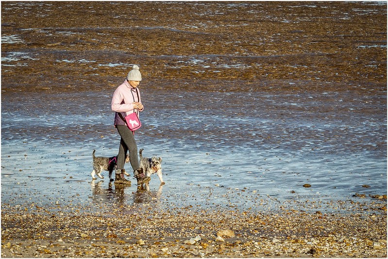 It is the attention to detail which shows through here. The composition is text book with the figure given more space in front of them than behind to walk into. The timing is spot on as well with the walkers' foot raised and the front dog in an excellent position. In an ideal world the other dog would have been fully in view as well. Finally the colour palette of blues and oranges combine together to complete this nicely taken image. |