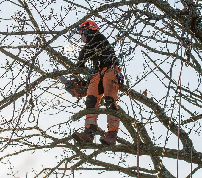 Wow, this looks ike a brave man! Not only is he up a tree but he is also wielding a potentially dangerous implement. I wonder if it would be possible to emphasise the perceived jeopardy by somehow accentuating the tree surgeons height above the ground? The branches and ropes could be seen as a distraction but the bright helmet saves the day which is nicely placed in the frame. |