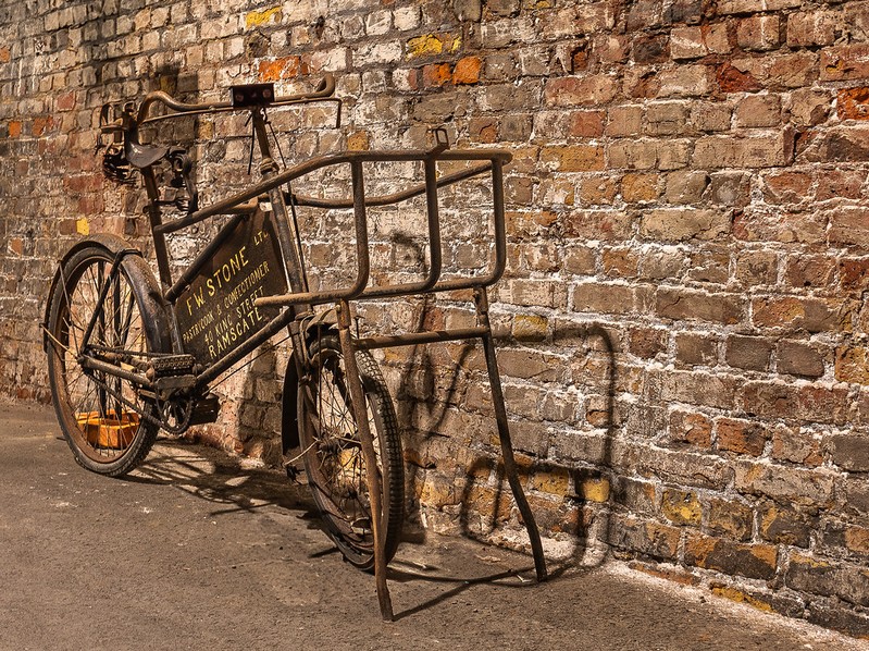 I wonder what stories this bike could tell? The patina and rust which is well captured here reveals it's age and the orange/brown colours all add to the old feel. I think this could have been a good candidate as a sepia toned monochrome image. I might have cropped off the right of the image to create a square format image. Text can be a distraction in an image if it is not linked to th subject but here it perfectly reflects some more of the subjects story. |