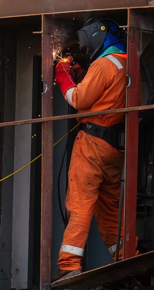 Taking an image such as this obviously means taking heed of safety precautions which is why the photographer is away from the subject. (I note the welder has also taken safety precautions which is good to see). This is more of record type shot of this welder which is good but perhaps a more effective pictorial image would have been to zoom closer into the top half of the image and where the action is around the welding torch. Still well seen and well taken. |