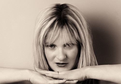 There is a nice quality hear with superb detail especially in the hair. I like how the hands and arms form a nice supporting base to the composition. The use of sepia is an interesting idea. I like the lighting but I wonder if the dark shadow could be lifted to balance the background more? Nevertheless, an engaging portrait. |