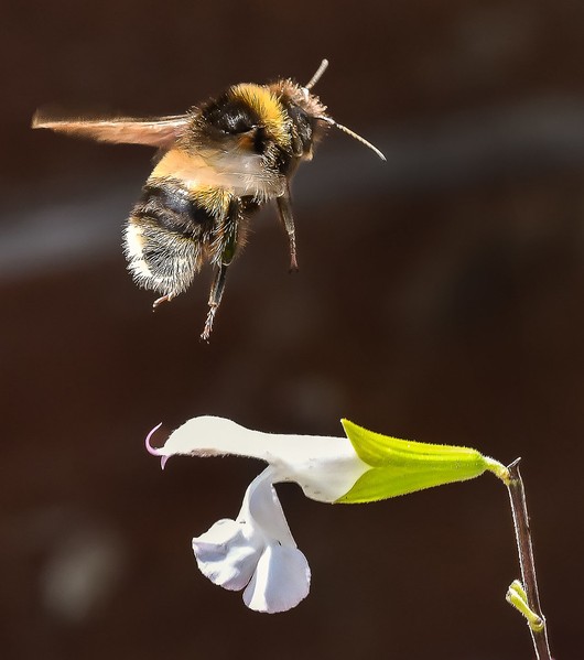 This is a nicely arranged composition. The bee and the plant are nicely placed and the story is well told. The quality suggests this could be a sectional enlargement as the sharpness is not great and the contrast is a little high but it is a nice image. |