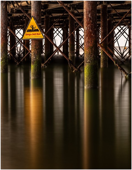 There is much to enjoy here. The use of a long exposure has created nice movement in the water and the arrangement of the pier supports is greatly enhanced by the colours and especially the warm glow on the foremost leg. The sign is a nice finishing touch and well placed. |