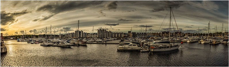 judging by the effect in the sky this bears the hallmarks of a stitched panorama which if it is it has been accomplished very well considering the moving water in the image. The composition has been nicely arranged and well thought out for a panoramic picture. After much consideration I think I would have cropped out the harbour wall on the left although it does act as a stop on that side. |