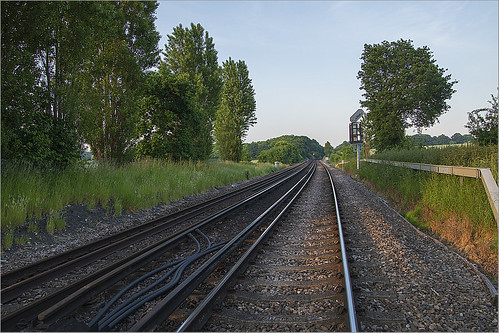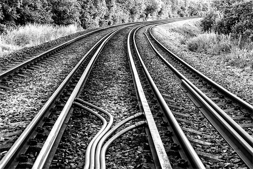 Railway lines are always excellent subjects for conveying depth but they are often shown as straight lines but this one has a curve which works very well. The cables in the foreground are a great addition to the composition. The contrast is a tag high but iy suits this subject. |