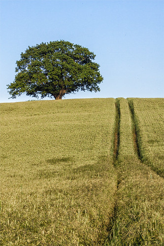 A simple but effective composition with a nice combination of colours. The lines through the crop is the key to how this works. With that blue sky and tree in full foliage this could be a good infra red subject. |