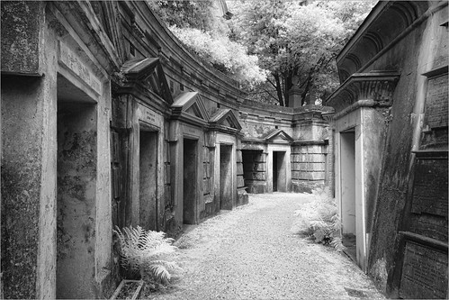 Monochrome infra red and cemeteries have always been a good combination for spooky images and again this image shows this. The composition is nicely arranged as it takes us through the image. The single piece of foliage is nicely placed on the left but it is the single door on the right which adds real strength to the composition. |
